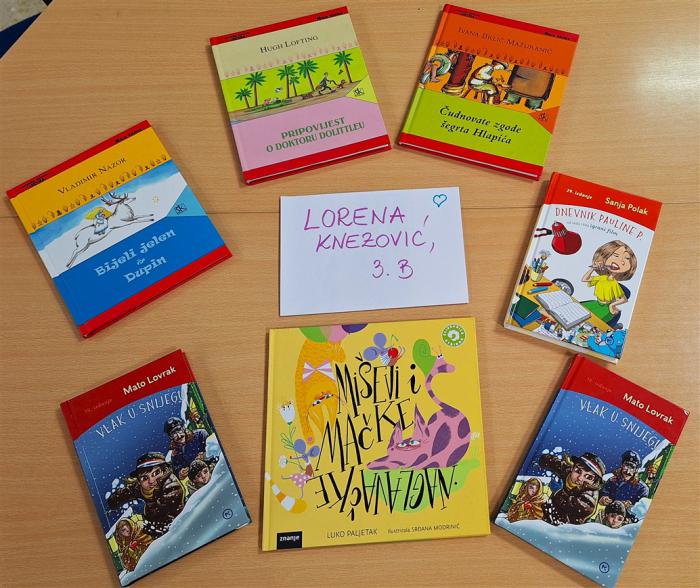 Lorena Knezović je ove školske godine krenula u 5. razred. Od svojeg 3. razreda školskoj knjižnici poklanja lektirne naslove koje čitamo u sklopu nastave književnosti. Do sada je školskoj knjižnici poklonila 20 lektirnih knjiga(!), glanc novih, drito iz knjižare, još mirišu na tisak… Lorena je prekrasna cura, pristojna, ljubazna, nasmijana, zrači pozitivom. Mi smo velika škola, školska knjižnica ima (pre)veliki broj korisnika. Neki izgleda ne čitaju puno pa se vidi da im glave nisu baš najpametnije. Oni po lektirnim knjigama šaraju, zalijevaju ih raznoraznim tekućinama, gužvaju, trgaju i razbijaju. Nakon takvih, ljubiteljima čitanja i školskoj knjižničarki Lorena je poput sunca nakon kiše ili poput najboljeg lijeka protiv ovih koji se s knjigama bore, umjesto da u njima uživaju.