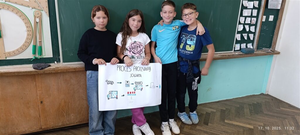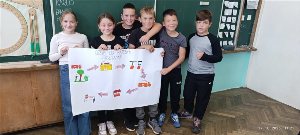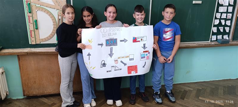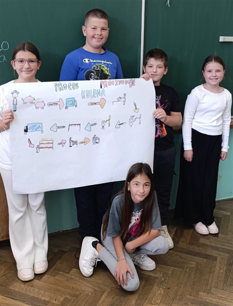 Obilježavanjem Svjetskoga dana hrane, odnosno Dana kruha i zahvalnosti za plodove zemlje, učenici su sudjelovali u razrednoj raspravi o važnosti hrane i o tome imaju li svi ljudi jednaki pristup hrani. Na konkretnim primjerima upoznali su cjelokupni proces proizvodnje prerađene hrane čime su produbili svoje znanje o podrijetlu hrane, načinu (kružnoga) funkcioniranja prehrambenoga sustava, ali i o različitim zanimanjima u prehrambenoj industriji. Grupnim radom učenici su prikazali mapiranje prehrambenoga sustava, tj. prikazali su vlastiti model procesa proizvodnje proizvoda prema odabiru (kulen, džem od marelica, kruh, jogurt), a kako su to izveli možete vidjeti na slikama u prilogu.