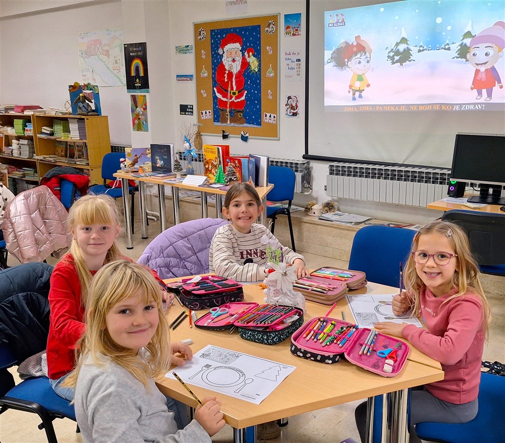 Vesele predblagdanske dane iskoristili smo za još jedno druženje s prijateljima iz prvih razreda. Do sada su prvašići boravili u knjižnici tijekom Mjeseca knjige, a kako smo tada uživali u bajkama, knjižnica nam se privremeno pretvorila u „Bajkaonicu“. Prije toga, kod samog upoznavanja prvašića sa školskom knjižnicom, družili smo se uz čitanje super slikovnice „Kako su Dora i Mario spasili hranu“, koju su kao dar odnijeli kući. U ovo vrijeme šarenih lampica, okićenih jelki i toplih osmijeha, knjižničarka je odlučila spojiti sve što smo do sada radili te pročitano i naučeno upakirati u lijepo, toplo i radosno adventsko druženje.