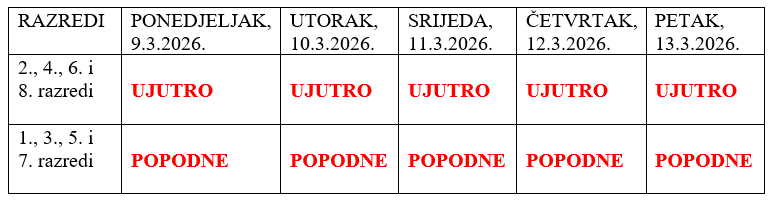 Osnovna škola „Sveti Matej“ Viškovo će zbog organizacije nacionalnih ispita za učenike 8. razreda iz Hrvatskog jezika (ponedjeljak, 9.3.2026.), Engleskog jezika (srijeda, 11.3.2026.) i Matematike (petak, 13.3.2026.) promijeniti smjene rada.