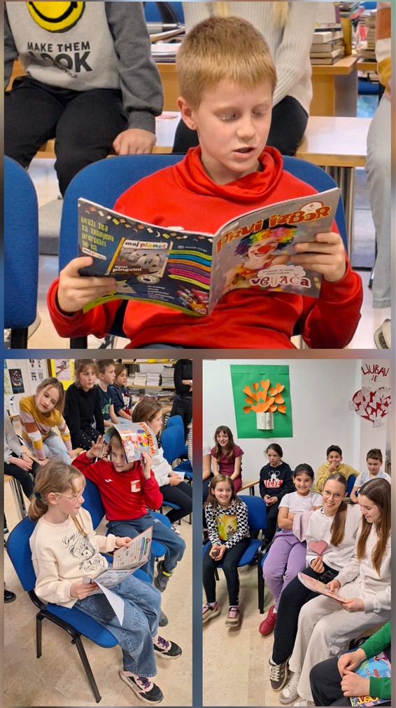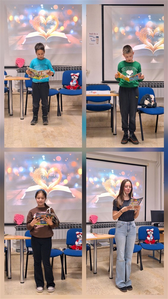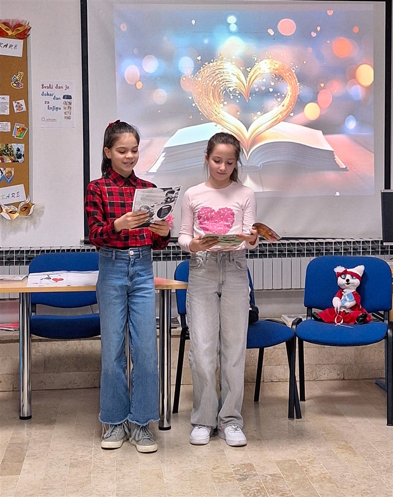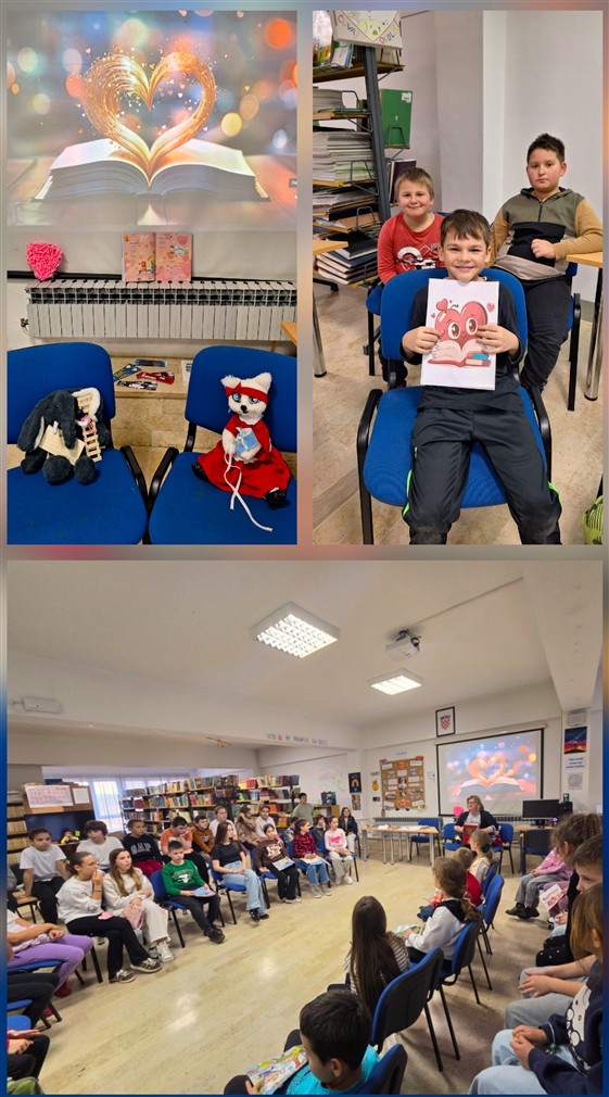 Led je probila Dea iz 2.a s pričom o medvjedu koji voli grliti. Ako može medo, možemo svi jer zagrljaja zaista nikada nije previše. S mede smo se prebacili na mišju ljubav, a saznali smo i jedan ljubavni recept. Veljača je godišnje doba maškara pa smo čuli i priču o ljubavi pod maskama. Sve su nam to glasno, izražajno i fenomenalno pročitali Leon, Gabriel, Ellie i Natali iz 2.a!  Natali, Naomi i Ivano iz 4.c izišli su pred publiku sa stihovima o školskoj ljubavi (i srcima na zidu škole), ljubavi u šetnji, plavim očima (tko se ne bi zaljubio u takve?!) i „tko se svađa, taj se voli“ stihovima. Za kraj je Matea iz 4.c pročitala zanimljivosti o najpoznatijem ljubavnom paru (Romeu i Juliji) i legendu o Amoru (za prijatelje Kupidu). Ne trebamo niti spominjati da četvrtaši čitaju odlično, tečno i izražajno jer su česti korisnici školske knjižnice. Na samom početku druženja koristili smo i enciklopedijski rječnik pa saznali što je legenda. Knjižničarka je veselom društvu ispričala legendu o dobrom svećeniku Valentinu i poprilično zločestom caru Klaudiju II. Valentin je 14. veljače 269. godine svojim životom platio što je slavio ljubav, ali je zbog svoje plemenitosti proglašen zaštitnikom ljubavi i tako mi taj dan slavimo i obilježavamo kao Dan zaljubljenih ili Valentinovo.