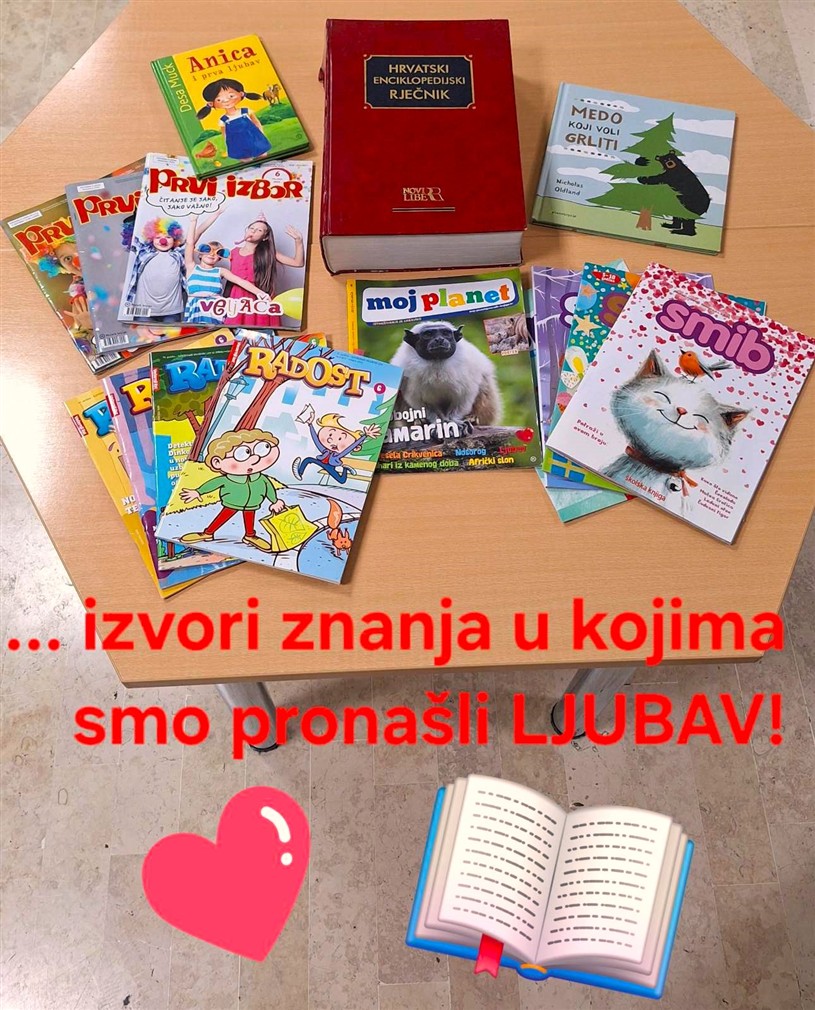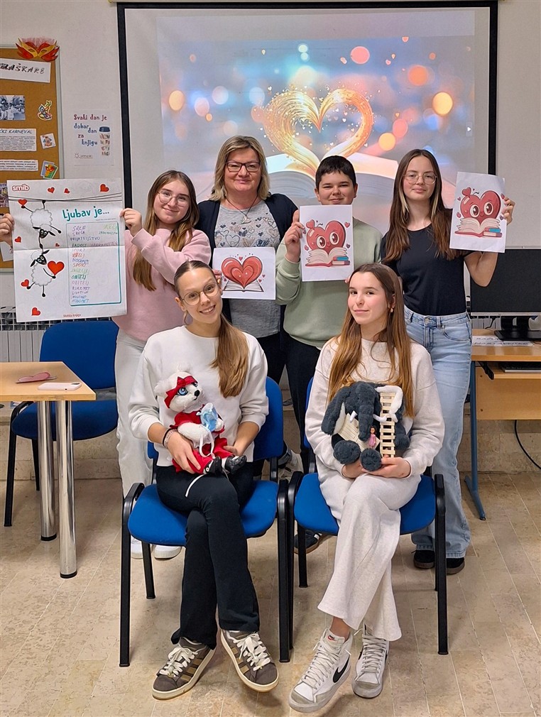 U našoj školskoj knjižnici Valentinovo (iliti Dan zaljubljenih) slavi se svake godine, obavezno i neizostavno. Naravno, naša je proslava ljubavi tradicionalno povezana s knjigama i čitanjem. Ove godine smo odlučili širiti ljubav i sve dobro što ona nosi kroz međugeneracijsko izražajno (GLASNO) čitanje. Učenici 2.a  i  4.c razreda pronašli su ljubav u dječjim časopisima i knjigama te odlučili lijepe ljubavne misli, savjete i drevna znanja podijeliti jedni drugima. Mladi knjižničari (Iva, Ema, Silvija, Angelina & Noah) također su malo prokopali stranice između korica i polica školske knjižnice pa su i oni pročitali par ljubavnih pjesmica.
